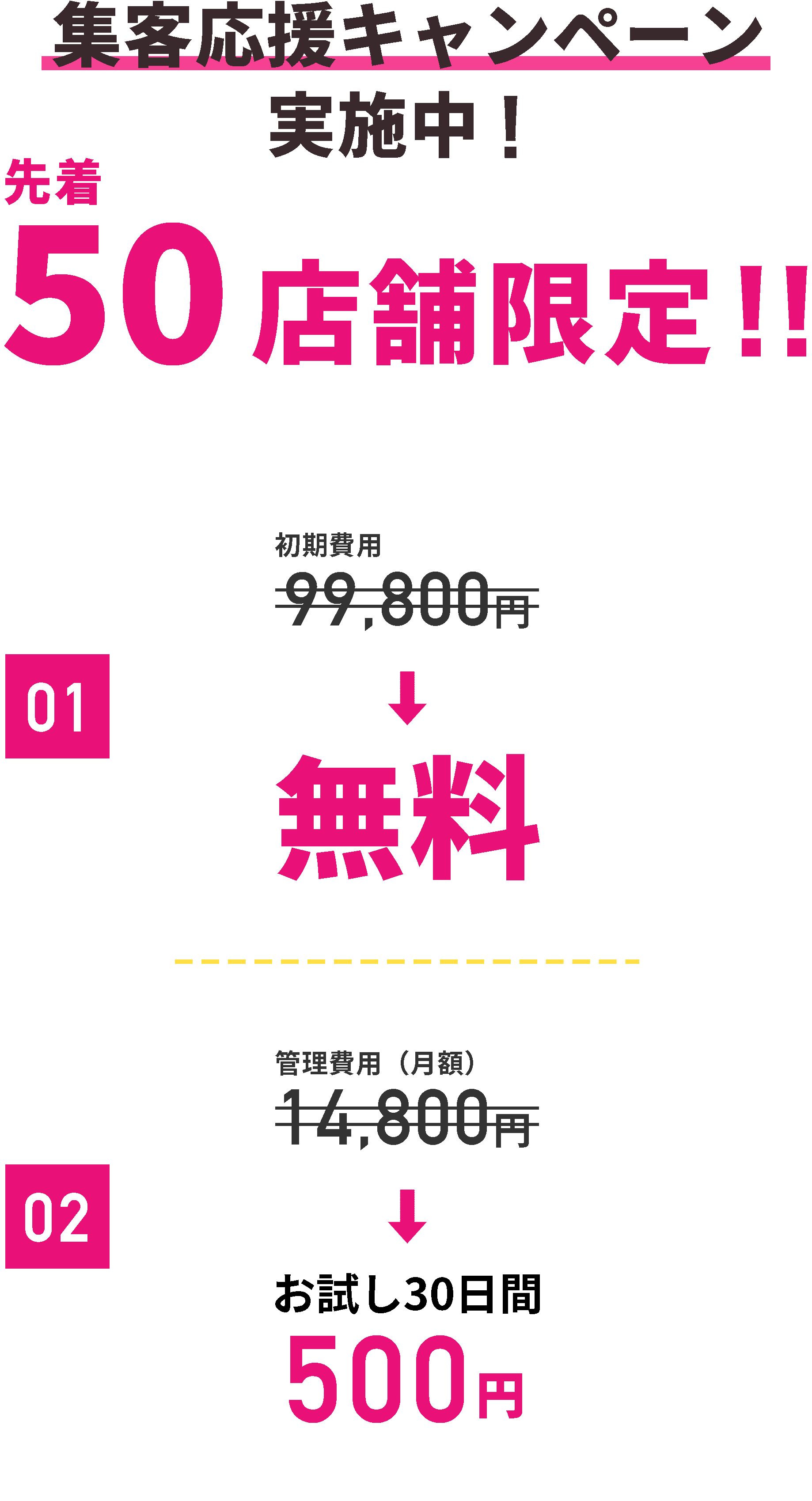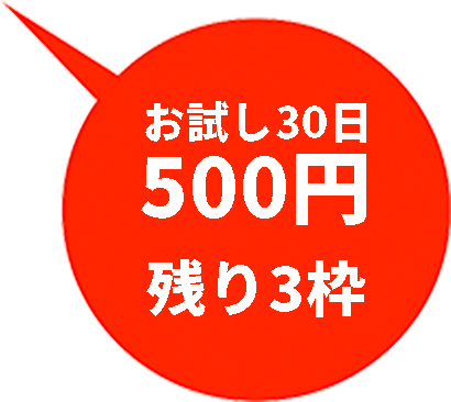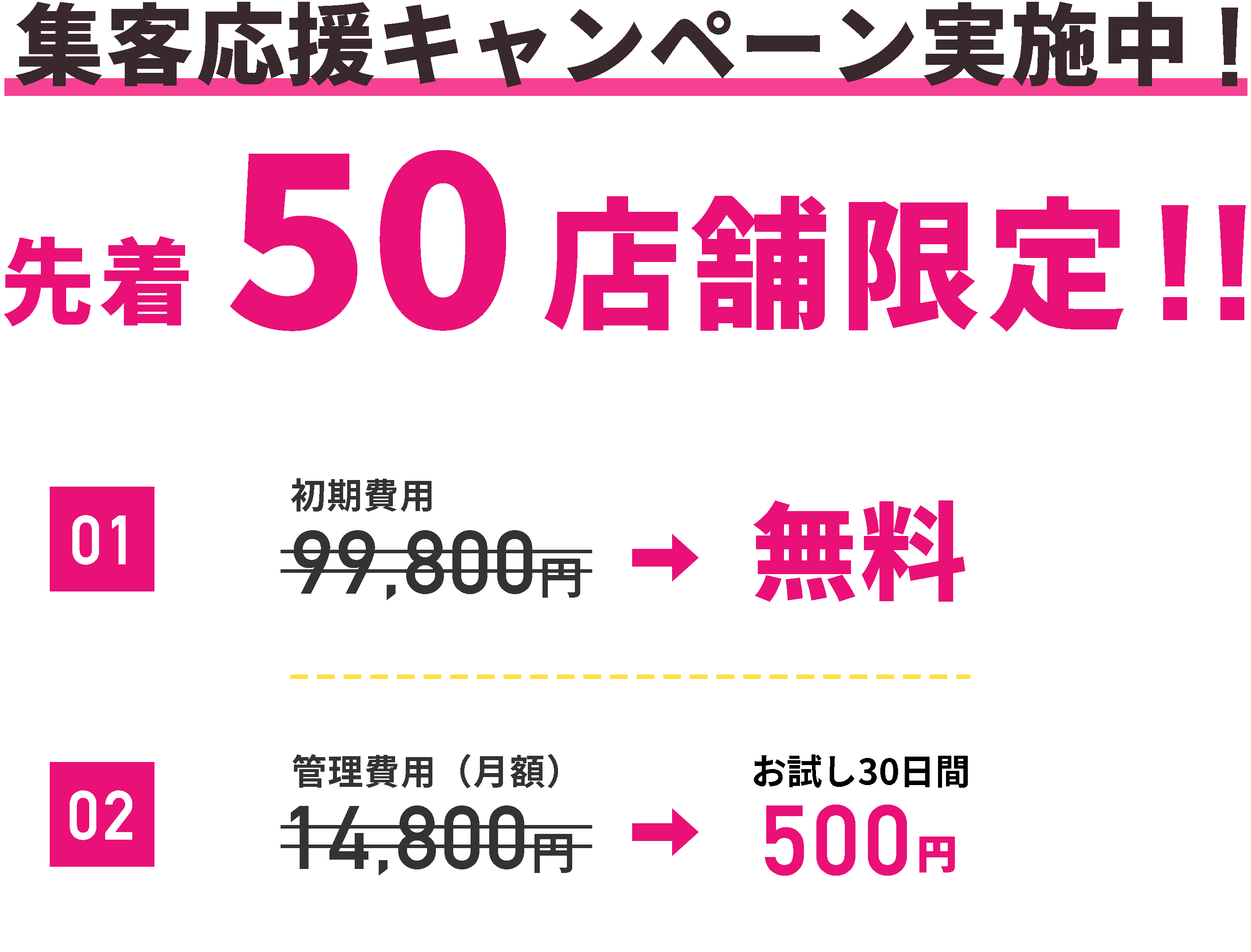 現在実施中の集客応援キャンペーンを利用することで「初期費用無料・お試し30日間500円」でスタートできますのでキャンペーンを利用した導入がオススメです。