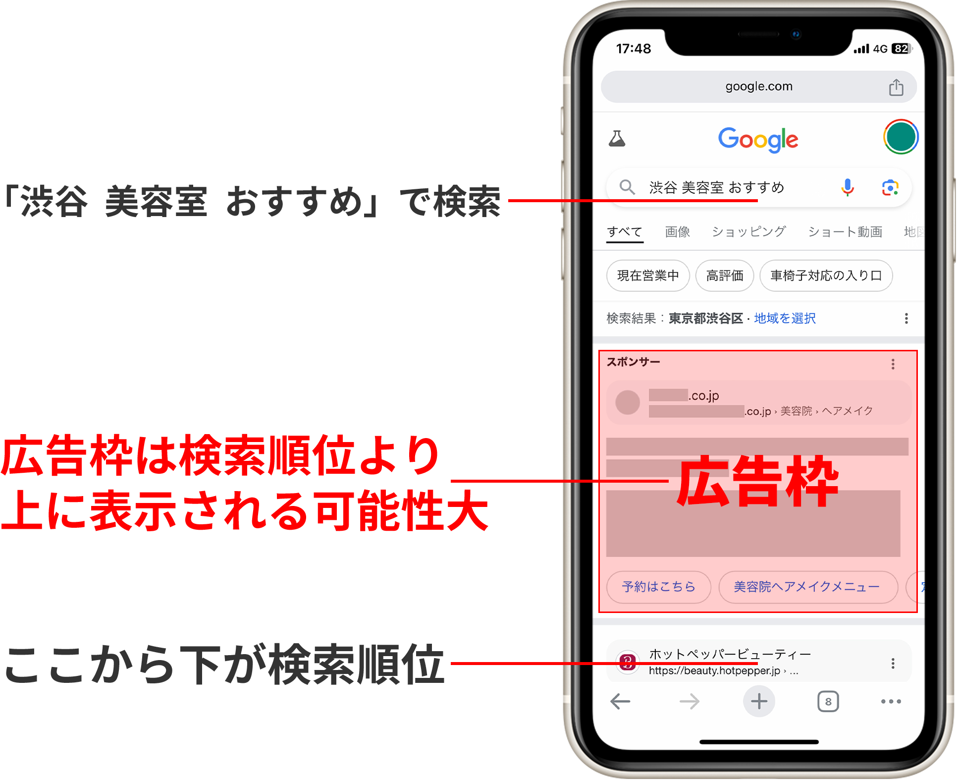 例えば「渋谷 美容室 おすすめ」と検索した場合、