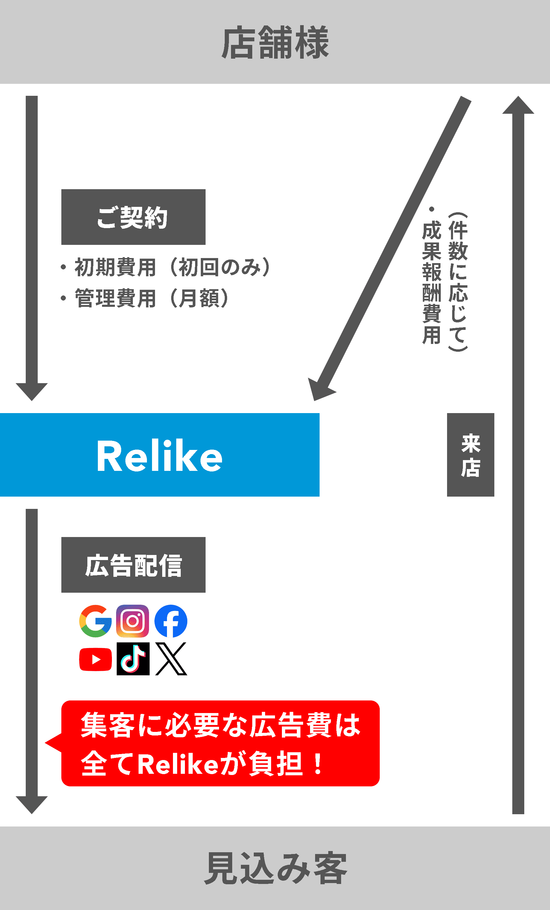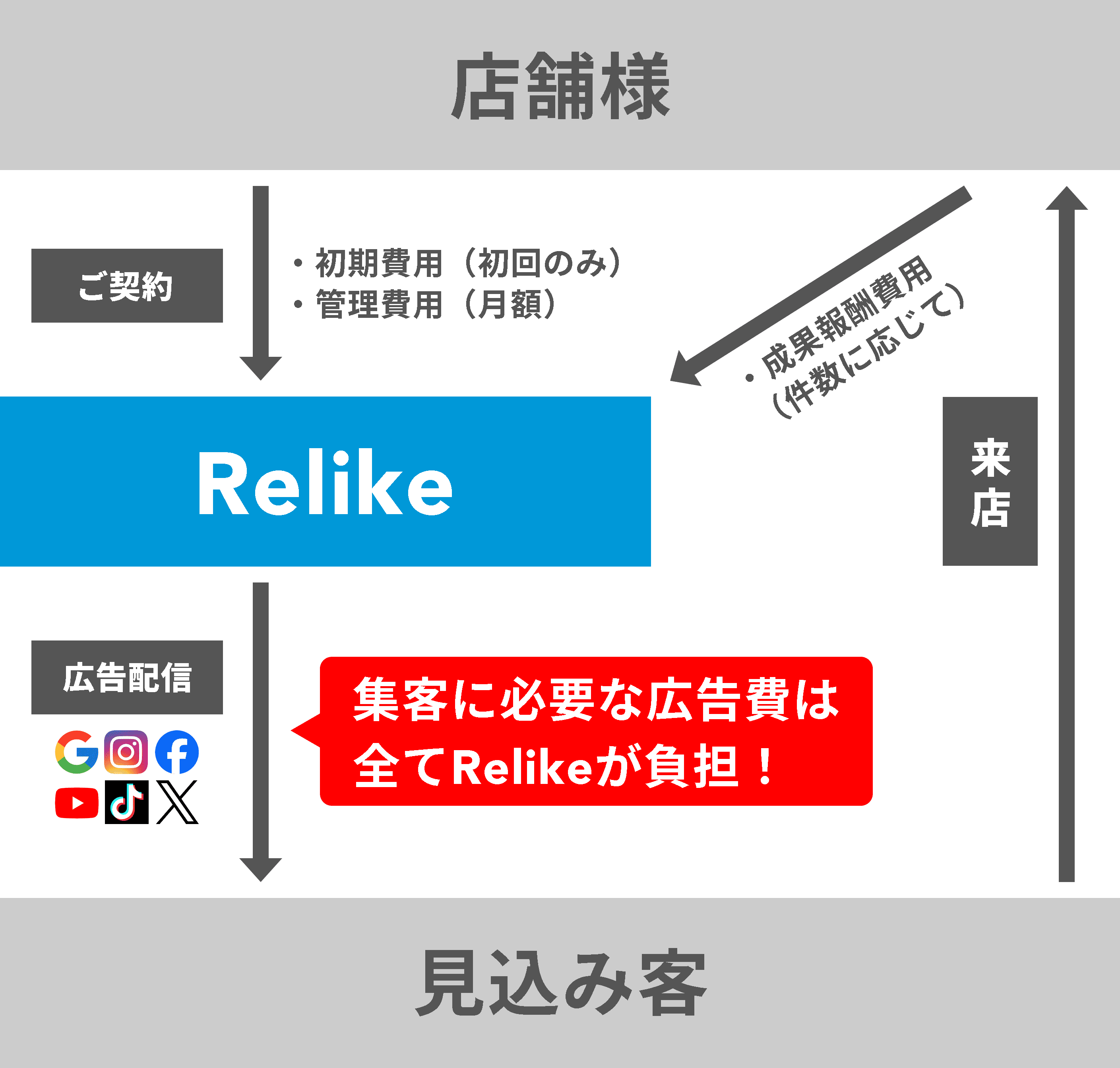 Relike側が費用を負担して広告枠に掲載するため店舗様の広告費の負担は無く、